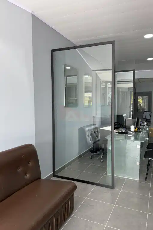 Mampara para oficinas de vidrio templado 10 mm. Acabados premium. Medidas personalizadas. vidriería – Aluminios del Sur.